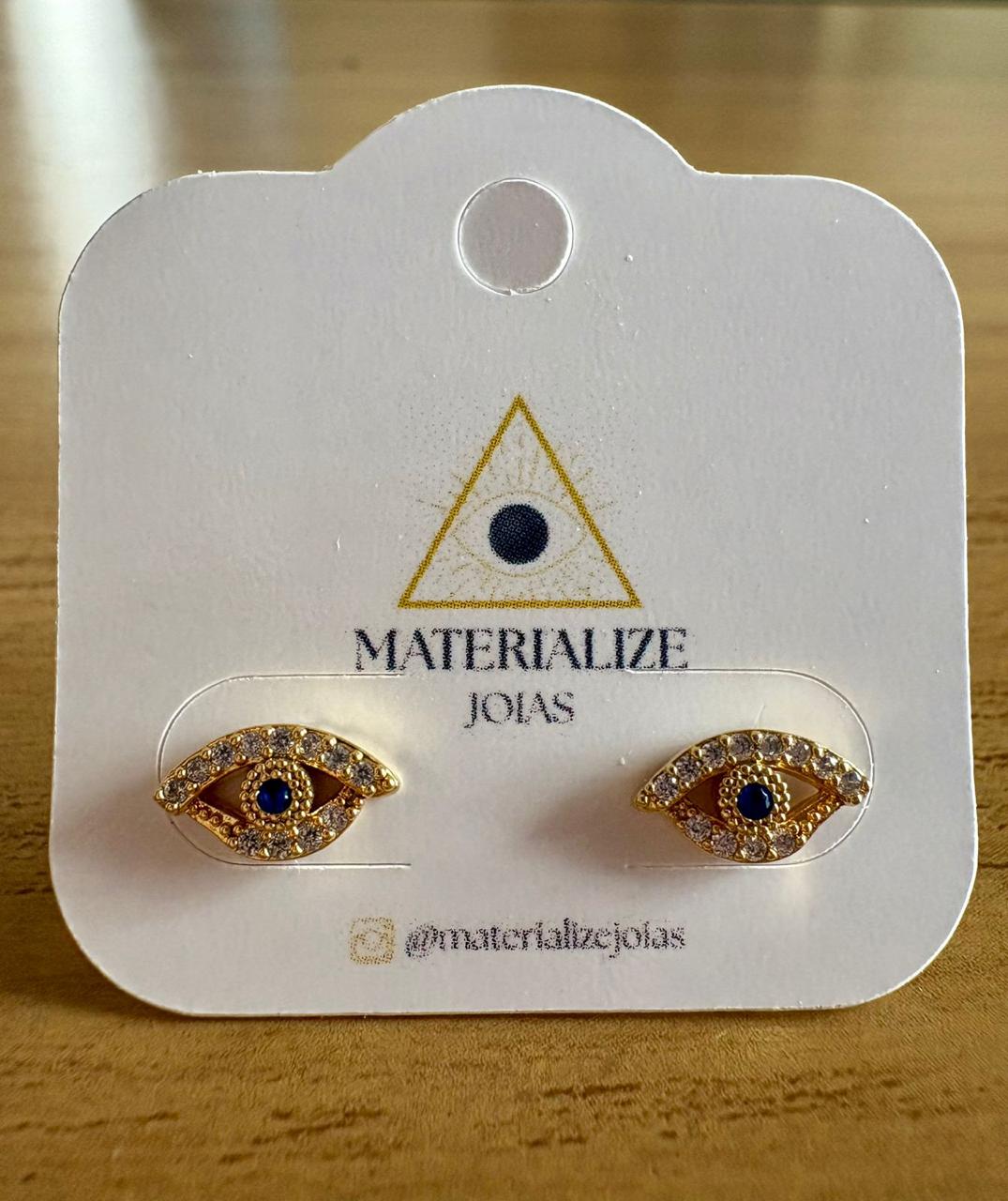 Brinco de olho revestido em ouro 18k com zircônias brancas e cristal azul no meio