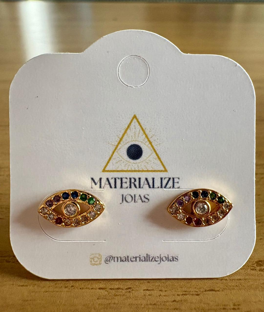 Brinco olho revestido em ouro 18k com zircônias coloridas e cristal transparente no meio